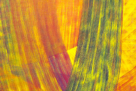 Acryl auf Leinwand — Die Arbeiten zeigen abstrakte Formen, die übereinander und nebeneinander mit dem Pinsel aufgetragen sind. Schwingende Linien bilden schwingende Farbbahnen. Zwischen den farbigen Linien, die mit einem spröden Pinsel aufgetragen sind, sind schmale Zwischenräume, durch welche die darunter liegende Farbfläche hindurch scheint. …